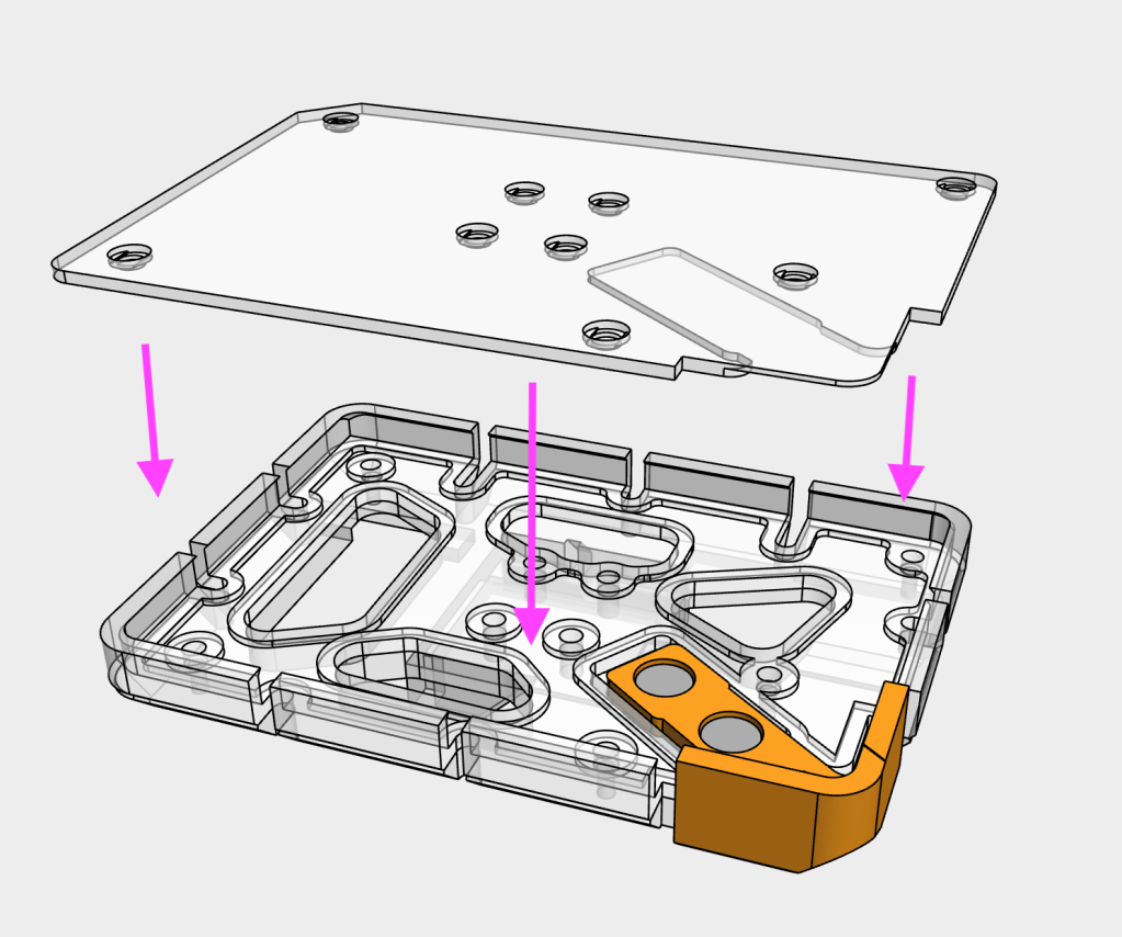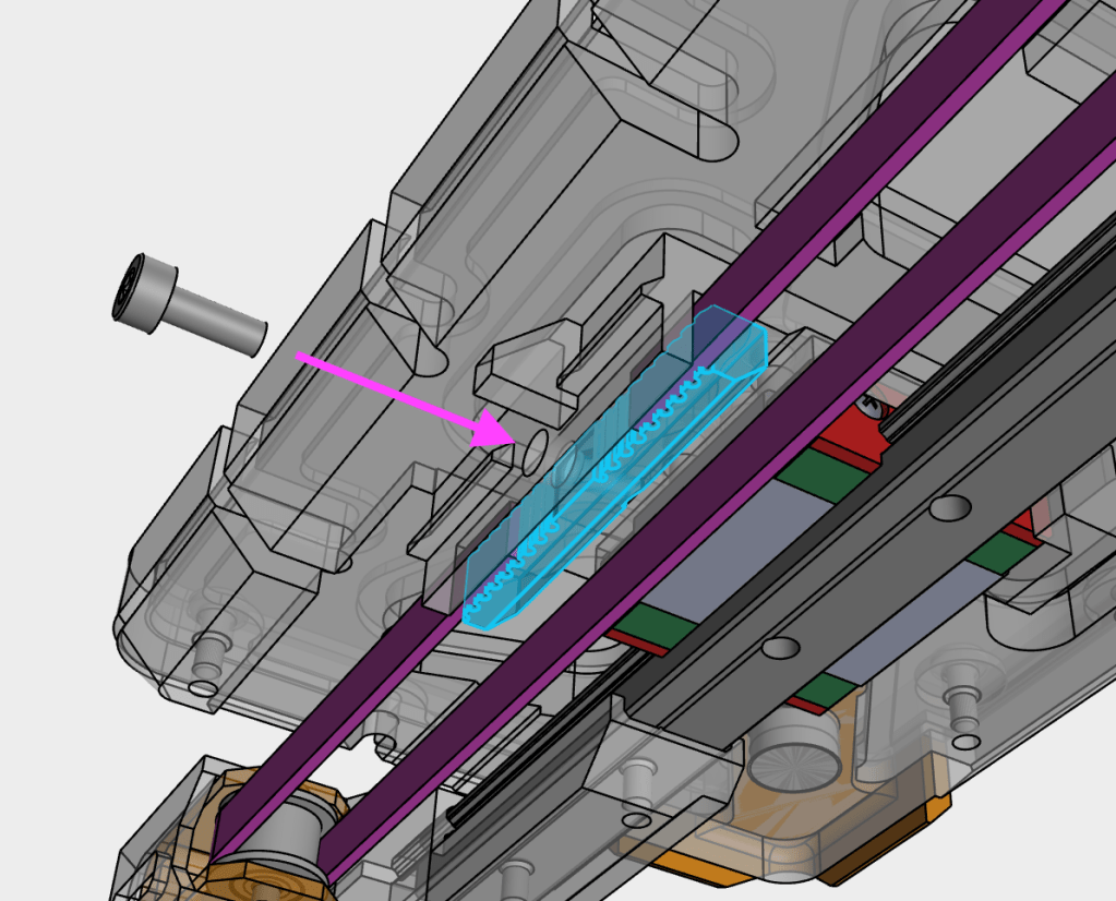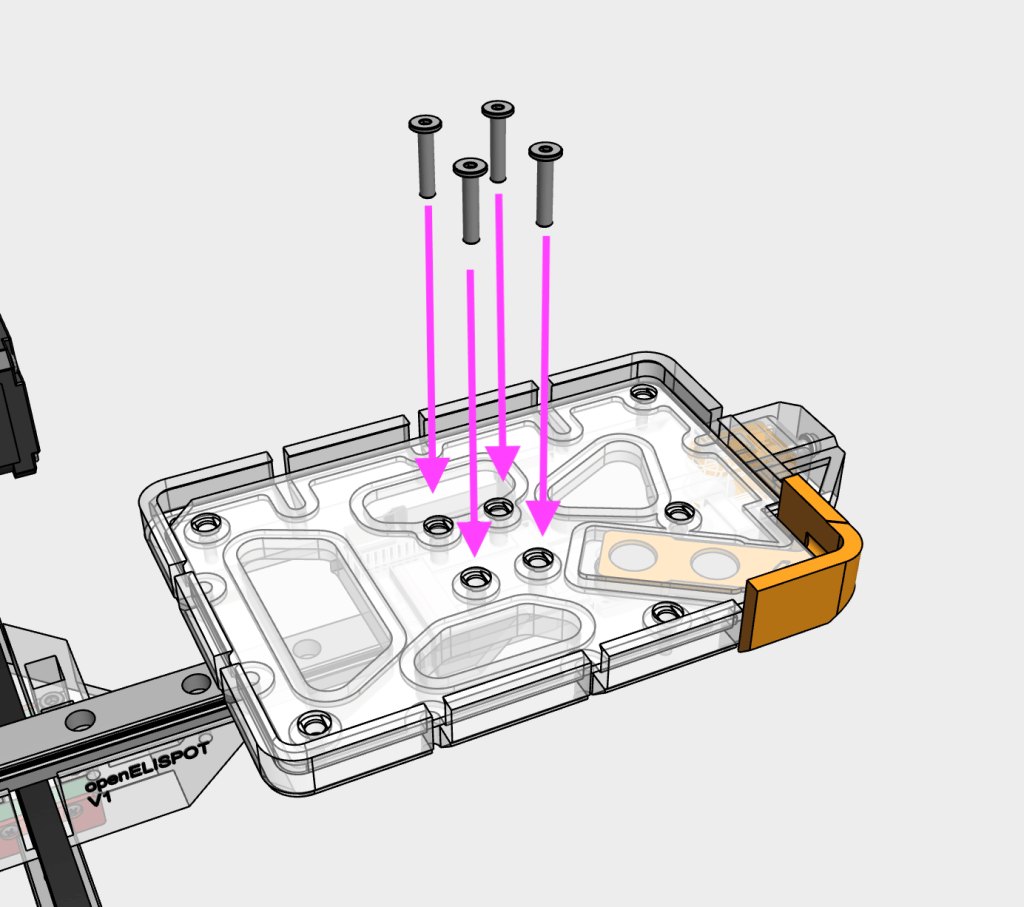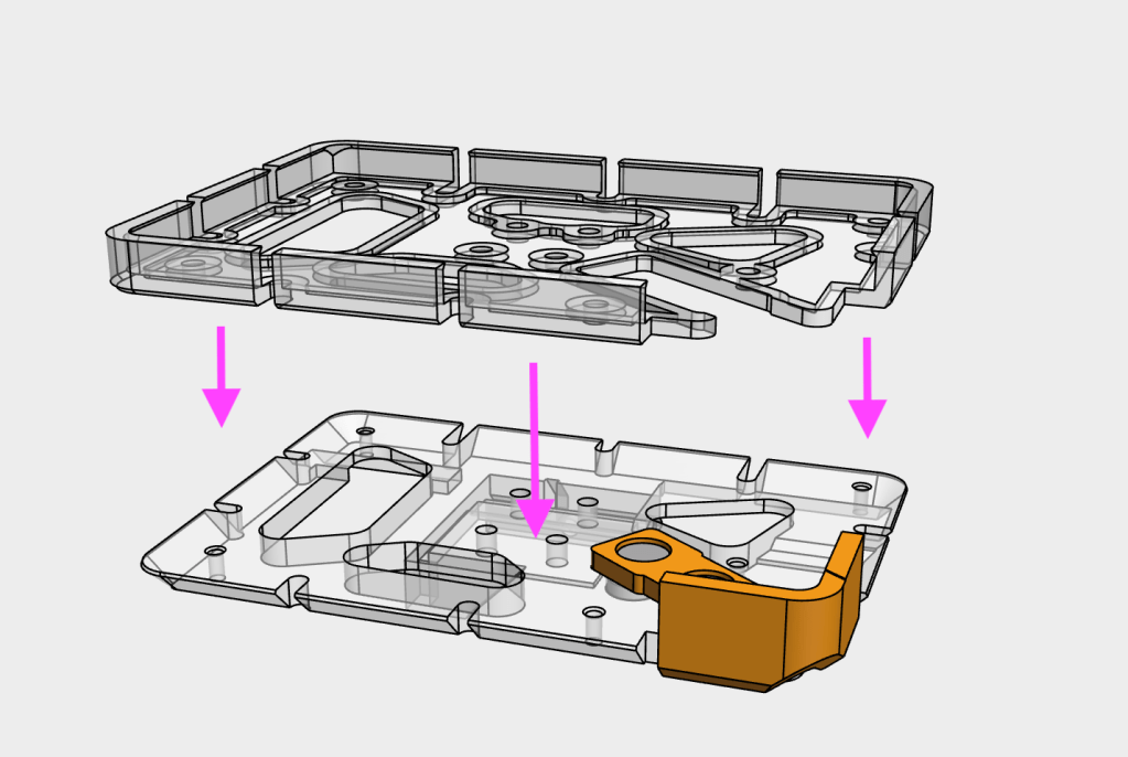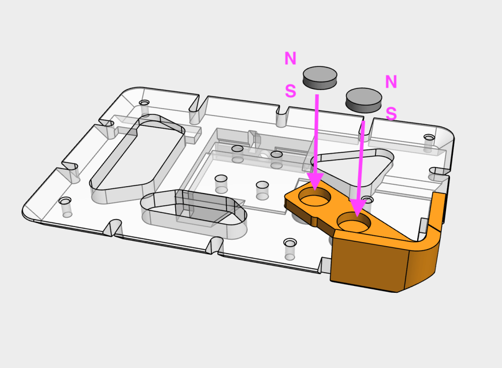 Place the plate_pincher on top, aligning the magnet carrier with the magnets in the plate_carriage. Place 2 10×2.0 magnets into the plate pincher to hold the two parts together