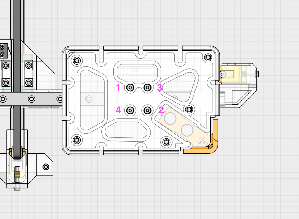 Using the grid paper, ensure that the plate stack is aligned parallel with the x axis linear rail. Once aligned to the best of your ability, fully hand-tighten the four M3x14 WHCS screws onto the x axis carriage in a cross pattern