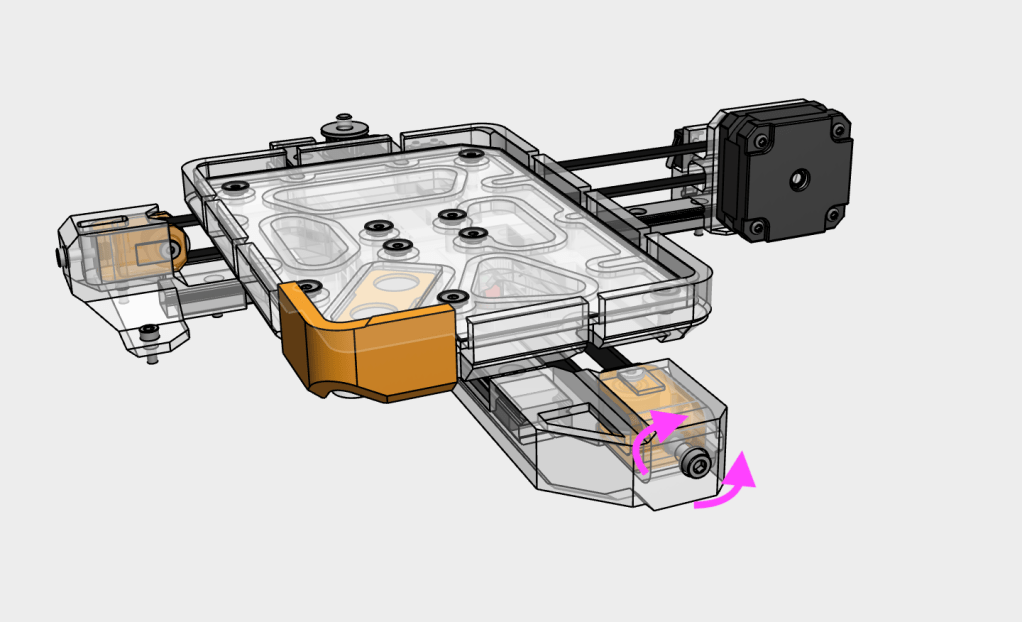 To adjust the belt tension on the x-axis, turn the tensioner screw clockwise (tightening) if needed. The ideal tension ensures the belt grips the motor pulley’s teeth firmly enough to prevent slipping, but isn’t so tight that it puts undue stress on the bearings or printed components. A good rule of thumb: with the motor off, you should be able to gently press the two sides of the belt together using just one finger. The belt should depress slightly (about 1–2 mm) and then spring back to its original position