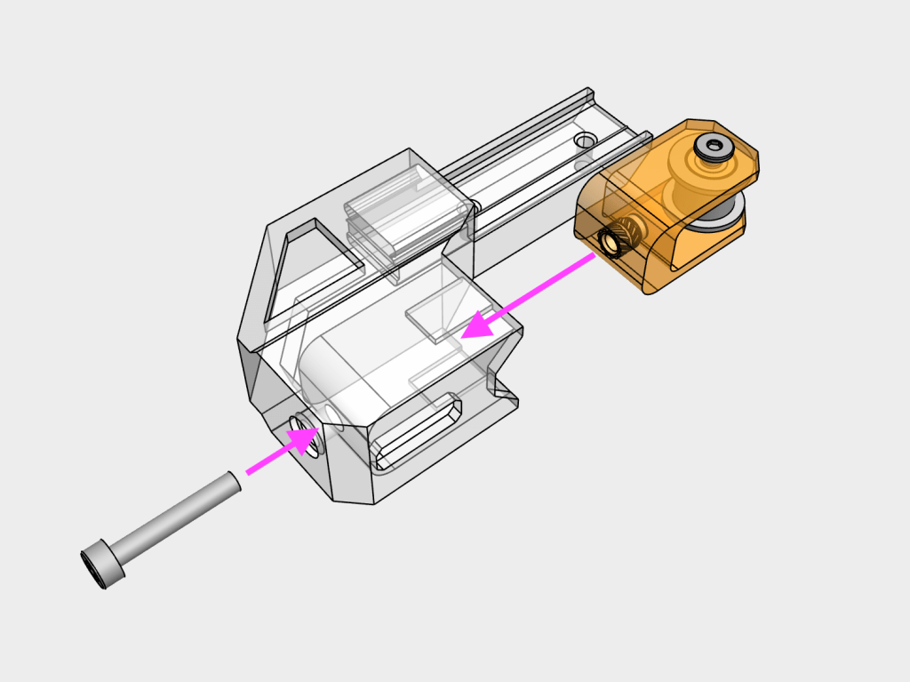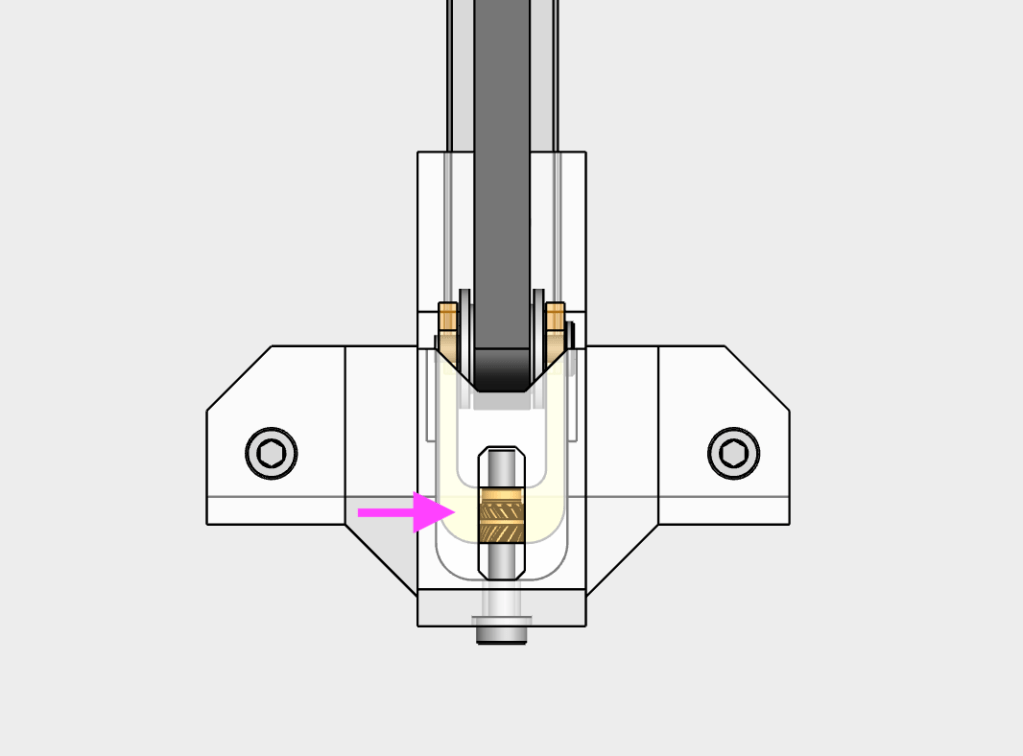Slide the completed idler_assembly into the x_axis_tensioner and secure with a M3x18 SHCS screw. Do not tighten all the way to leave room for belt tension adjustment later