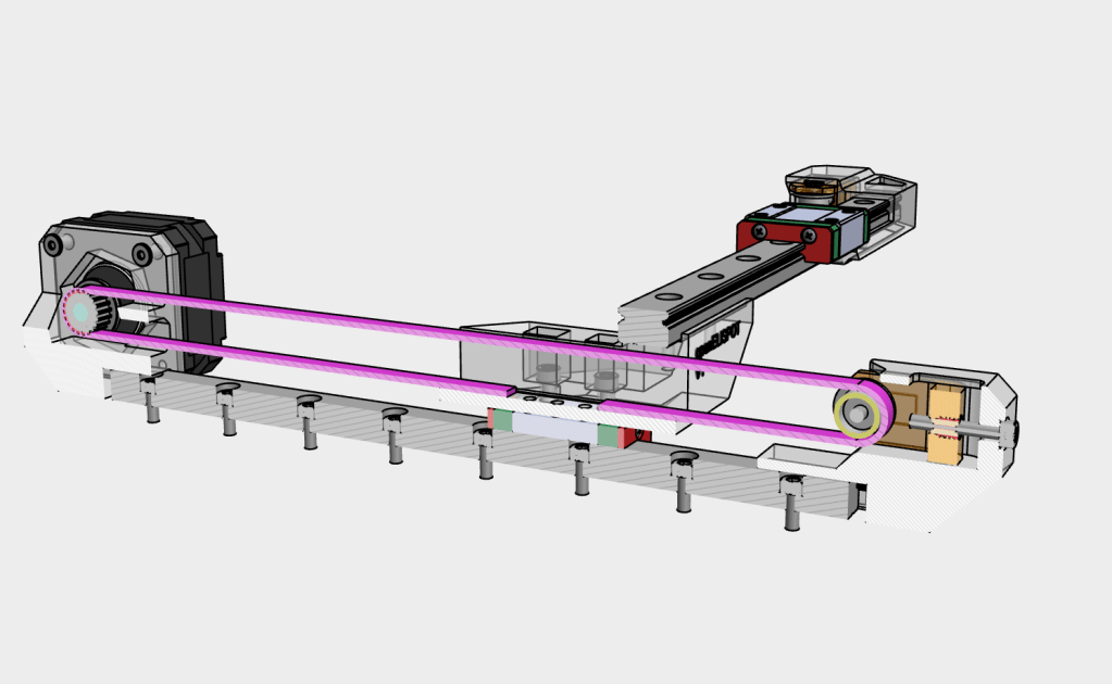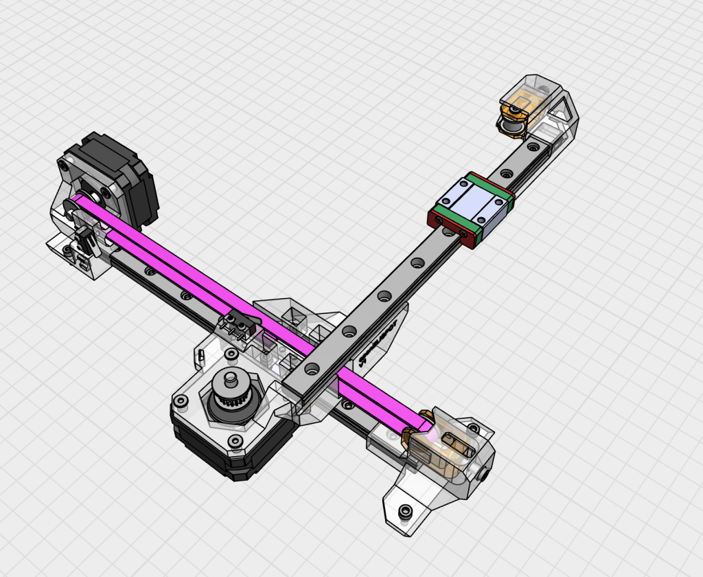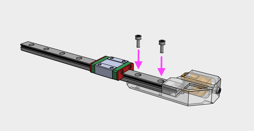 Slide the completed x-axis tensioner onto the linear rail and secure using two M3x8 SHCS screws. Note: that there may be a gap between the end of the linear rail and printed part, this is normal to accommodate minor deviations in linear rail length