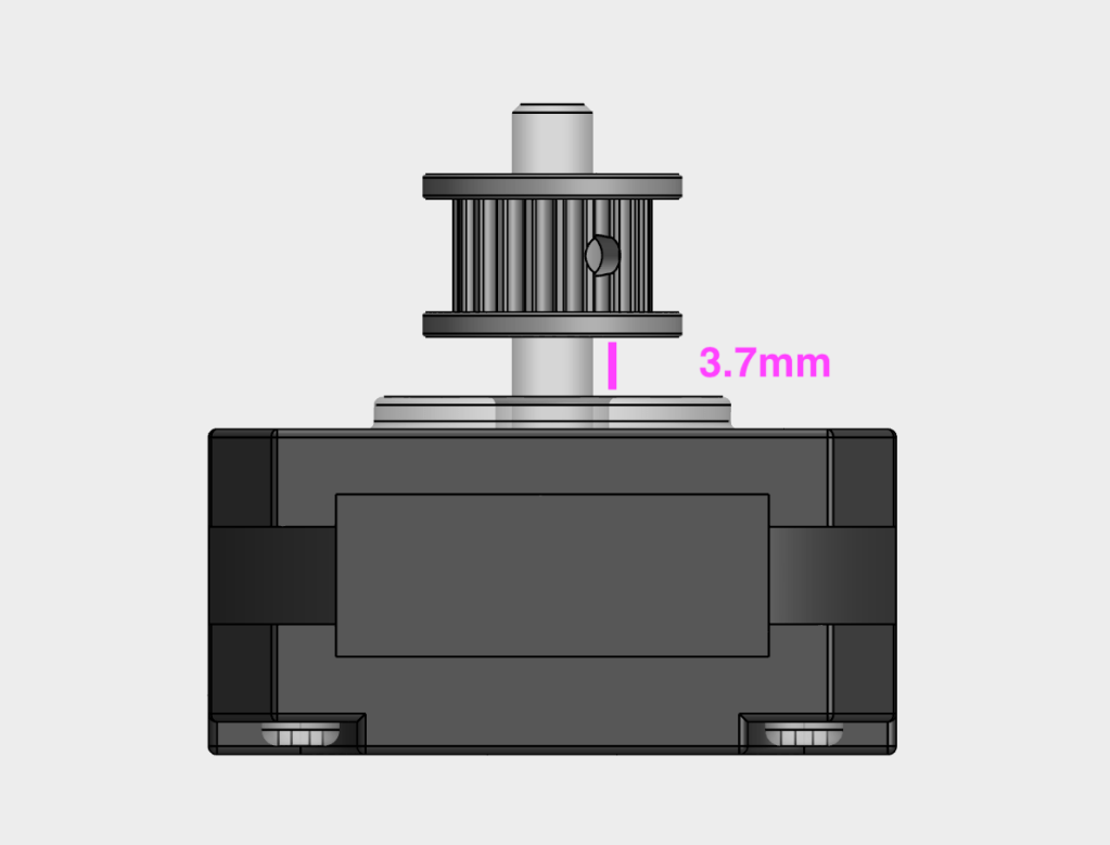 Secure the pulley onto the x axis stepper motor using the included grub screws. Ensure at least one of the grub screws is in contact with the flat part of the motor shaft. Leave 3.7mm of space between the motor and pulley.
