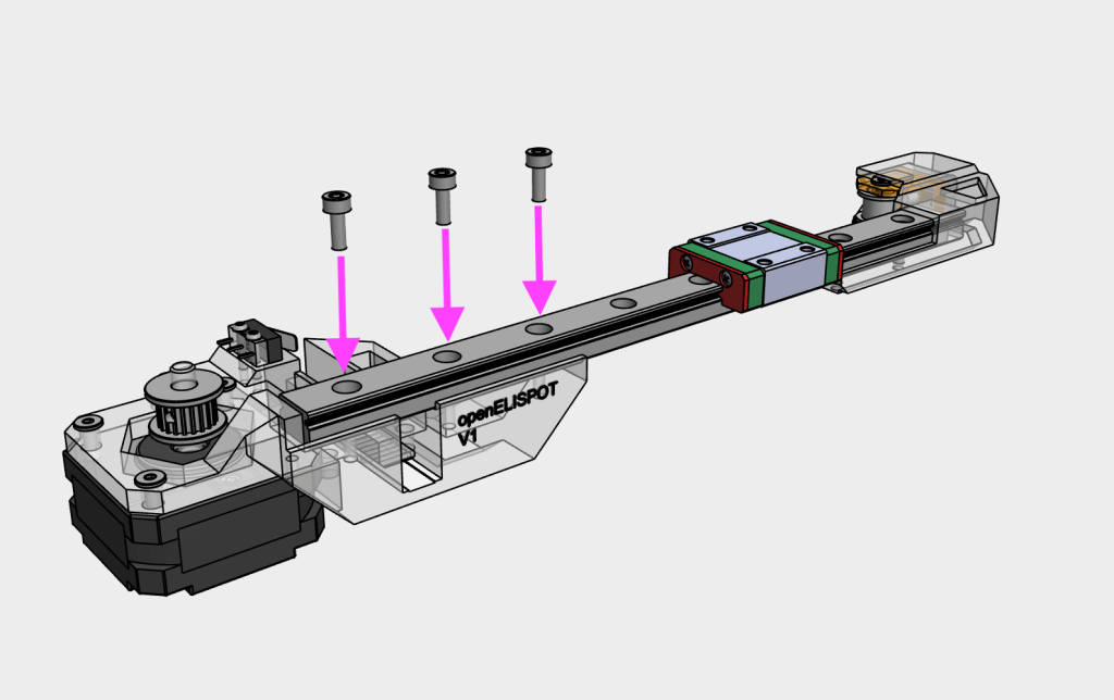 Mount the linear rail onto the y_monoblock using three M3x8 SHCS screws. Note: that there may be a gap between the end of the linear rail and printed part, this is normal to accommodate minor deviations in linear rail length
