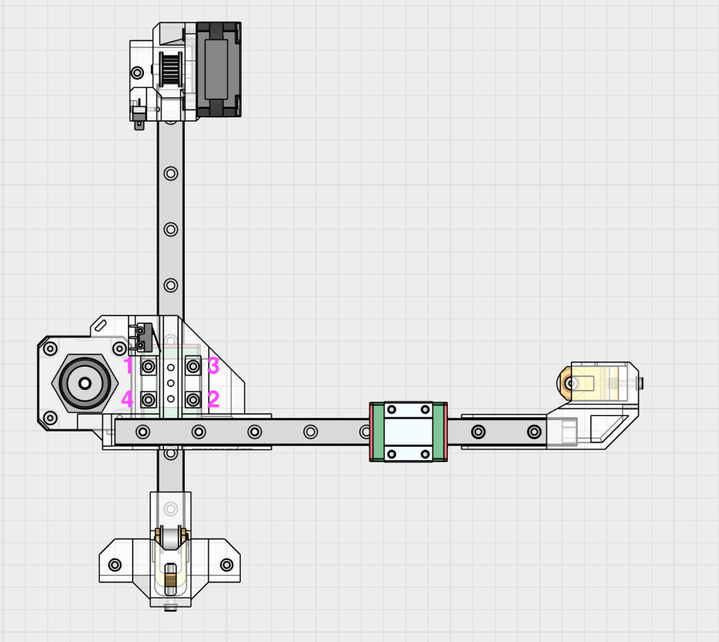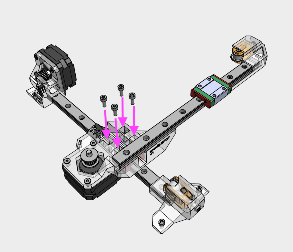Using grid paper, ensure that the x axis linear rail is perpendicular to the y axis linear rail. Once aligned to the best of your ability, fully hand-tighten the four M3x8 SHCS screws onto the y axis carriage in a cross pattern