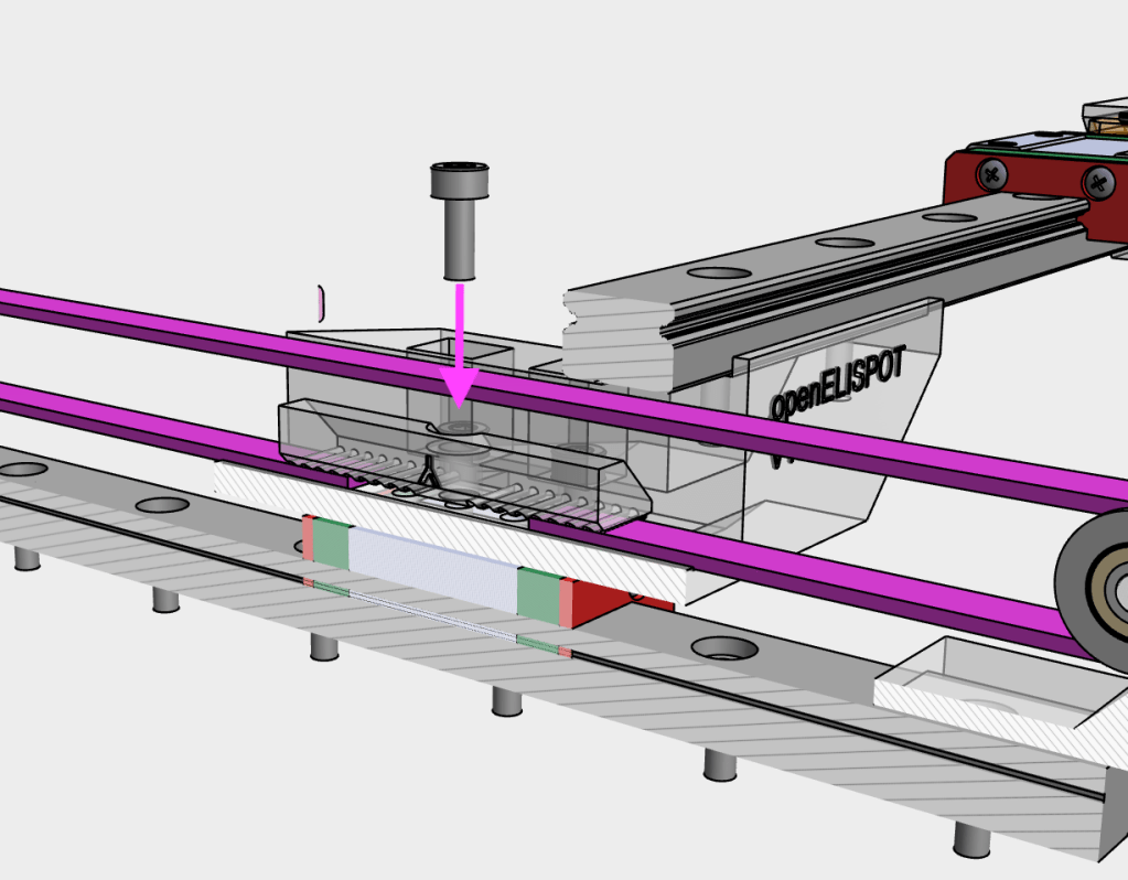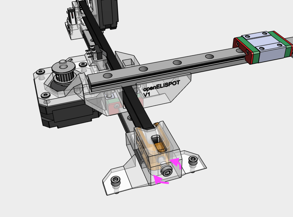 While holding the belt in place and centred, secure the belt onto the y_monoblock using the y_belt_clamp and one M3x8 SHCS screw