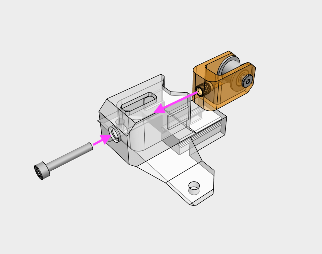 Slide the completed idler_assembly into the y_axis_tensioner and secure with a M3x18 SHCS screw. Do not tighten all the way to leave room for belt tension adjustment later