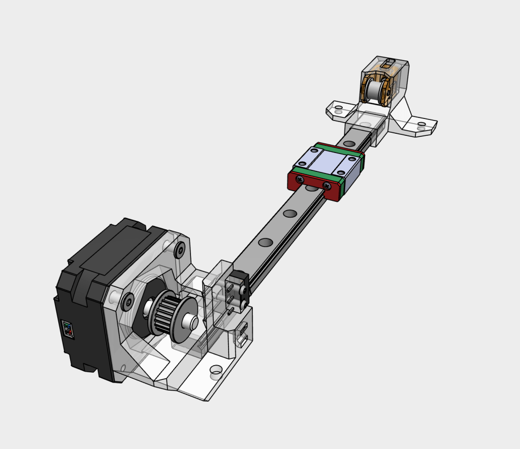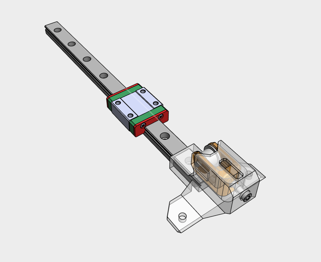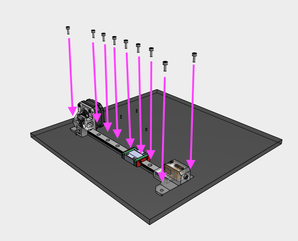 Secure the completed Y axis onto the base using M3x8 SHCS screws. Note: that there may be a gap between the end of the linear rail and printed part, this is normal to accommodate minor deviations in linear rail length